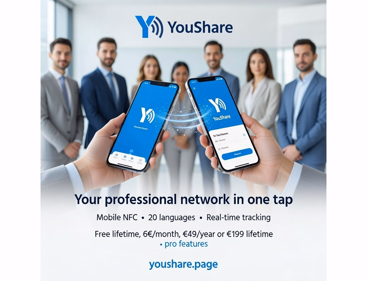 Digital business cards with NFC emulation. Share contact info instantly via smartphone tap or QR code—no physical cards needed. €49/year or €199 lifetime. Available in 20 languages. Perfect for modern professionals.