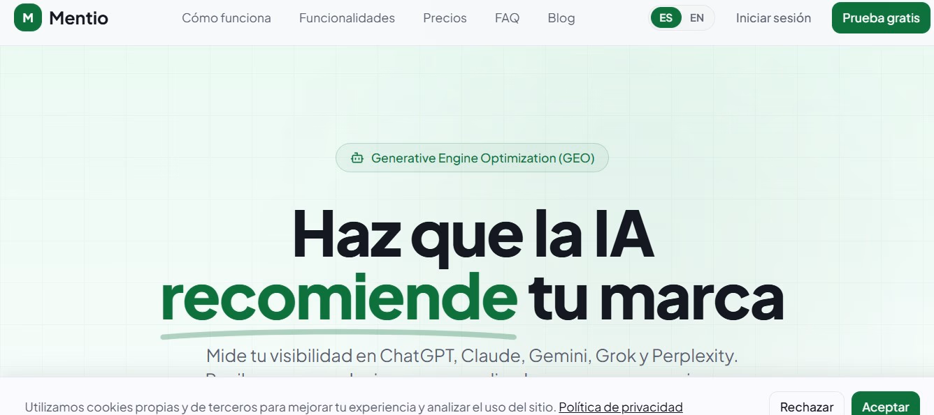 Mentio is an AI visibility analytics platform that shows whether ChatGPT, Claude, Gemini, Grok, and Perplexity mention your brand, product, or service.